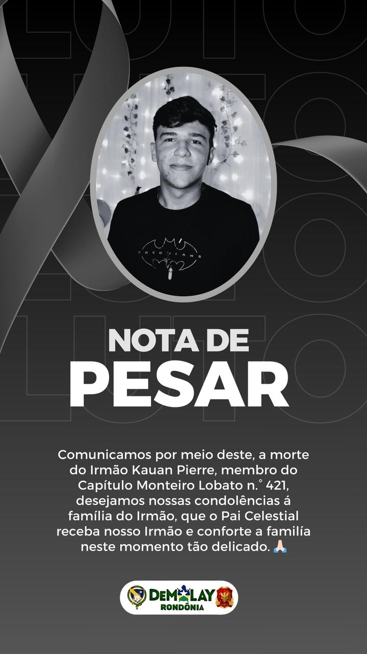 Faleceu na madrugada desta data o jovem Kauan Pierre Oliveira, de 21 anos, membro da Ordem DeMolay, vinculado ao Capítulo Monteiro Lobato nº 421, do município de Ouro Preto do Oeste, em Rondônia.